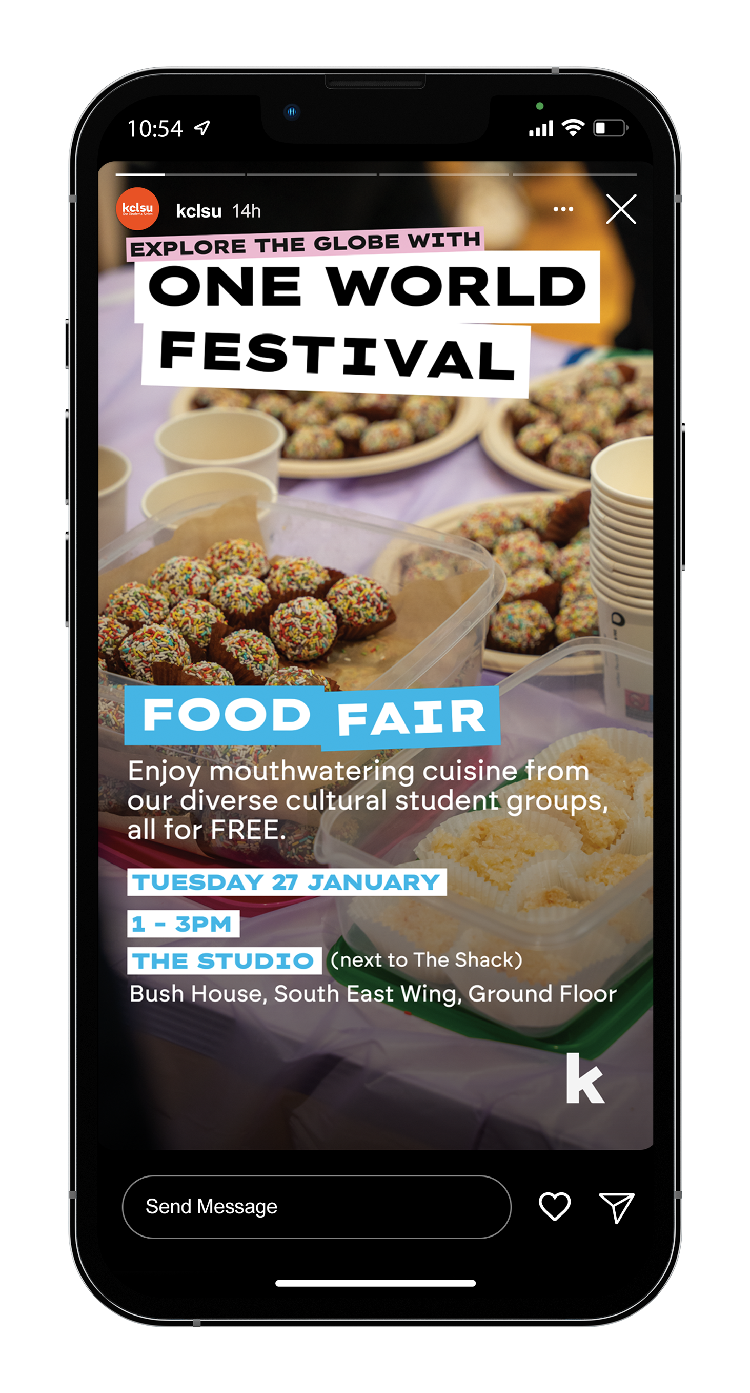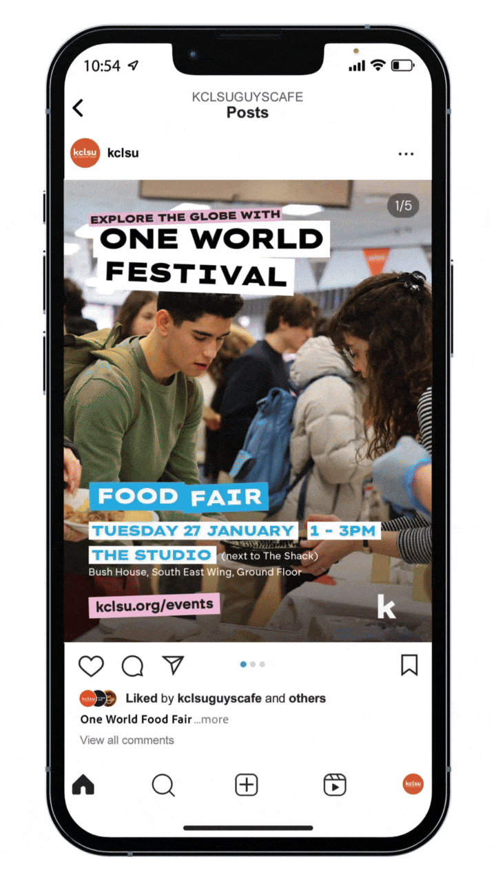 One World Festival showcases the diverse cultures and global communities at King’s through events including food festivals and film screenings. I created promotional assets to support the campaign across all KCLSU platforms and in person.